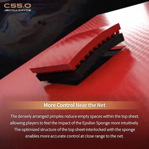 Más control cerca de la net: los picos densamente dispuestos reducen los espacios vacíos dentro de la capa superior, lo que permite a los jugadores sentir el impacto de la esponja Epsilon de manera más intuitiva. La estructura optimizada de la capa superior entrelazada con la esponja permite un control más preciso a corta distancia de la net.