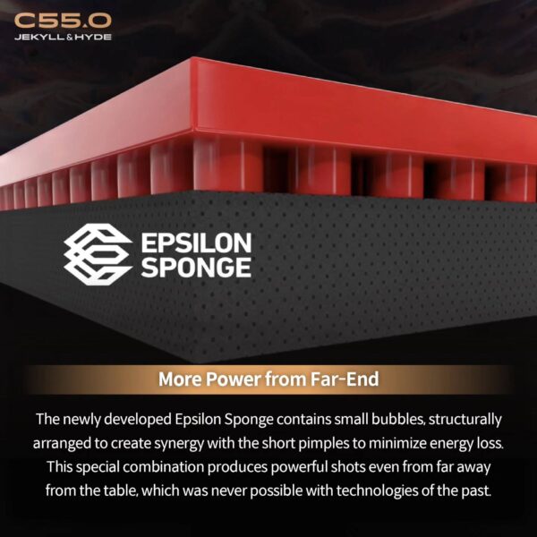 Más potencia desde lejos de la mesa: la esponja Epsilon recientemente desarrollada contiene pequeñas burbujas, dispuestas estructuralmente para crear sinergia con los picos cortos para minimizar la pérdida de energía. Esta combinación especial produce golpes potentes incluso desde lejos de la mesa, lo que nunca fue posible con las tecnologías del pasado.